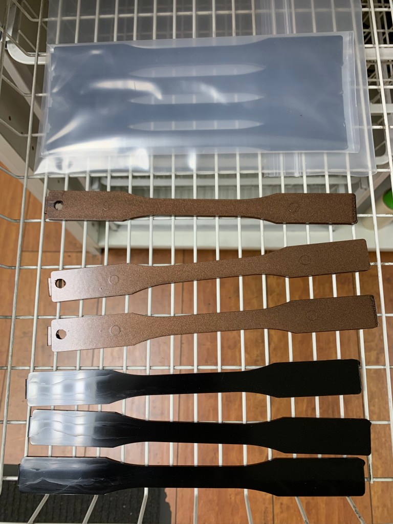 I spray painted the specimens with Krylon Fusion spray paint that is made for plastic. The can says that you can use it on any type of plastic. I coated the bars very well right after molding. I got a few runs because I wanted to get a thick coating on them.